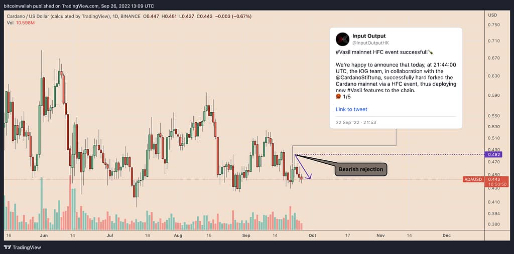 [ad_1] Cardano’s (ADA) long-awaited Vasil update went live on Sept. 22, which promises to make its blockchain more scalable and cheaper than before. However, this has failed to bring bullish momentum to the ADA market. Sell-the-news hampers Cardano ADA’s price has dropped by approximately 9.5% since the update and was changing hands for $0.43 on