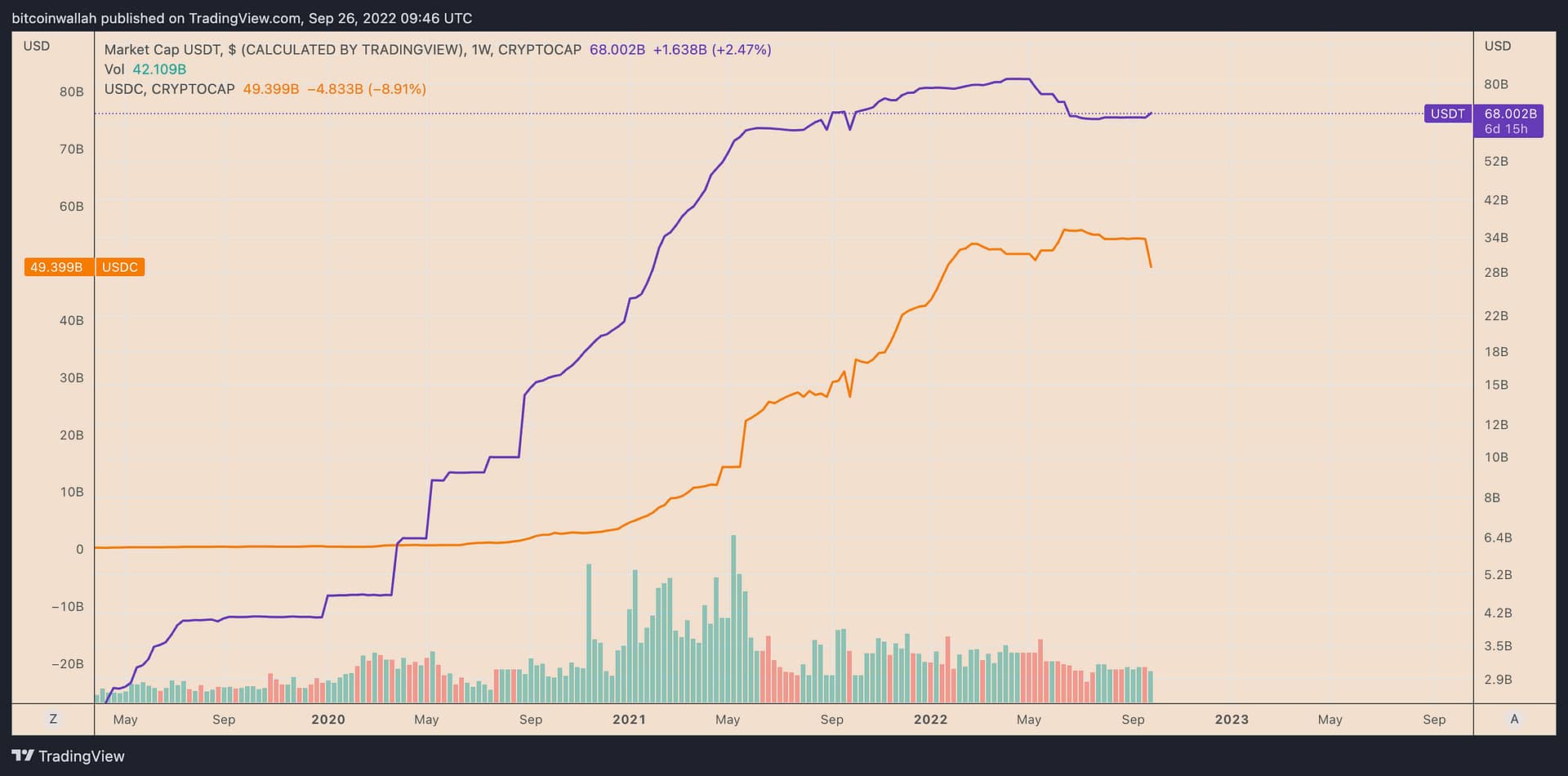 In contrast, the market cap of Tether (USDT), which risked losing its top stablecoin position to USDC in May, crossed above $68 billion on Sep. 26, albeit still down 17.4% from its record high of $82.33 billion in May 2022.