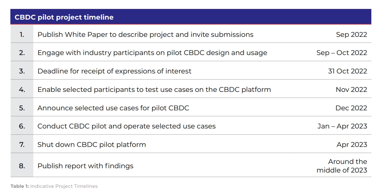 The report on Australia’s CBDC pilot project is expected to be released in mid-2023 based on indicative project timelines, as shown below.