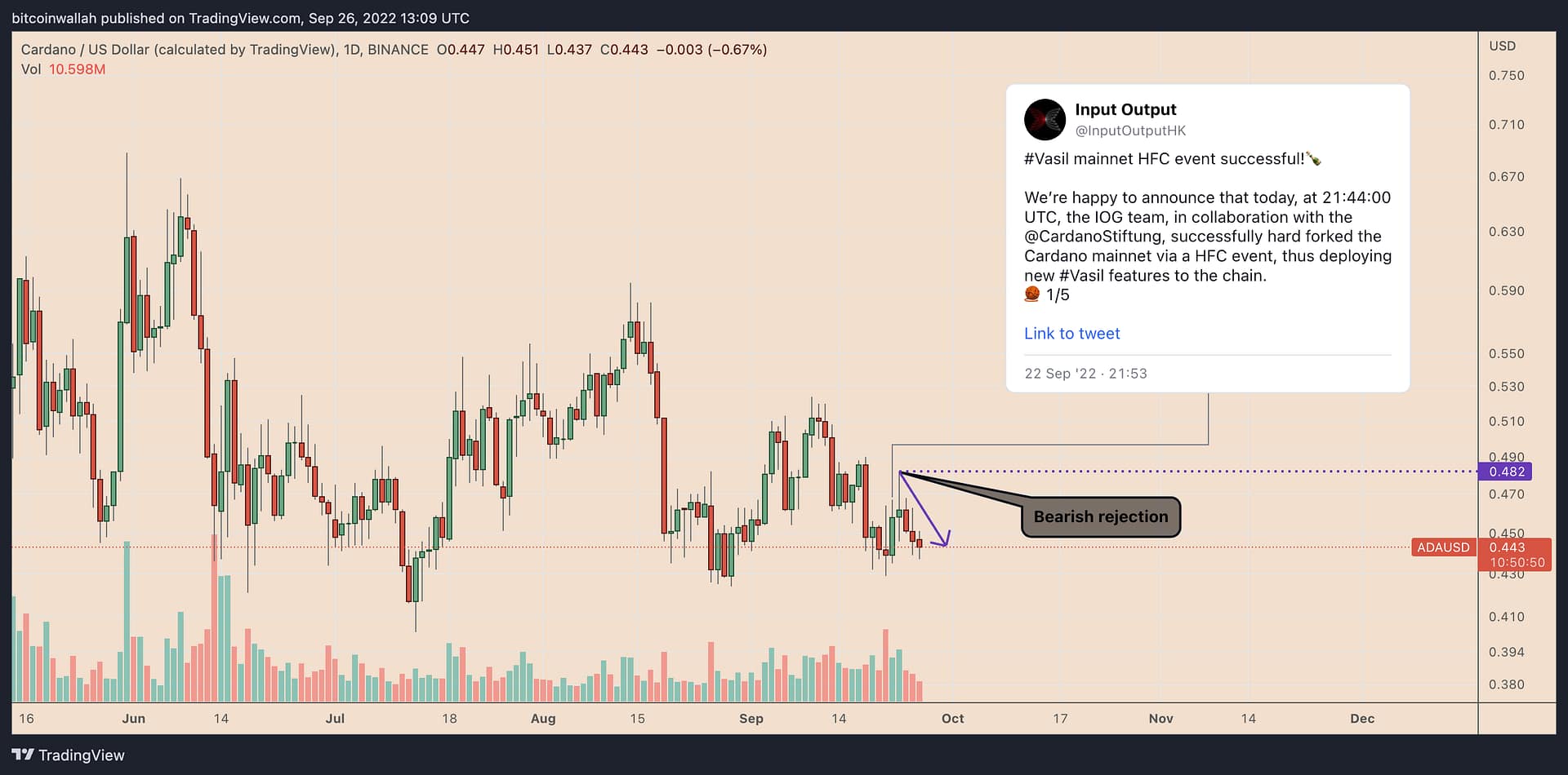 ADA’s price has dropped by approximately 9.5% since the update and was changing hands for $0.43 on Sept. 26. The ADA/USD pair’s drop was accompanied by a rejection candlestick on its daily price chart, confirmed by a brief rally to $0.48 on the day of the fork and a sharp correction thereafter.