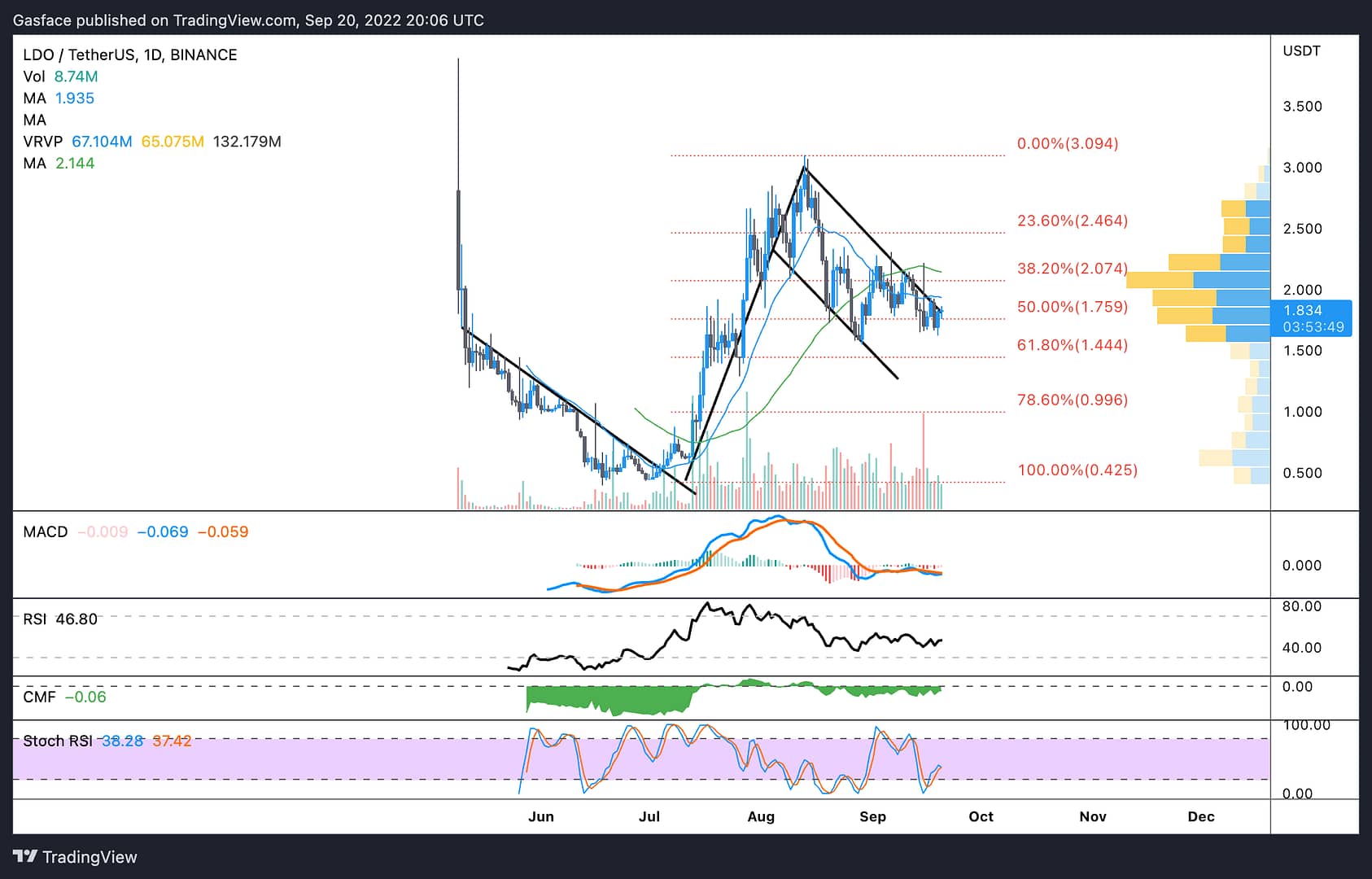 Lido (LDO) has corrected alongside Ethereum now that the Merge-trade fervor has subsided, but the asset currently trades in what some would say is a bull flag. While ETH bulls and traders might have taken profits on their long Ether positions, the Merge was a success, stakers and validators still derive yield from the altcoin and the fundamentals that turned investors bullish on Ether remain present.