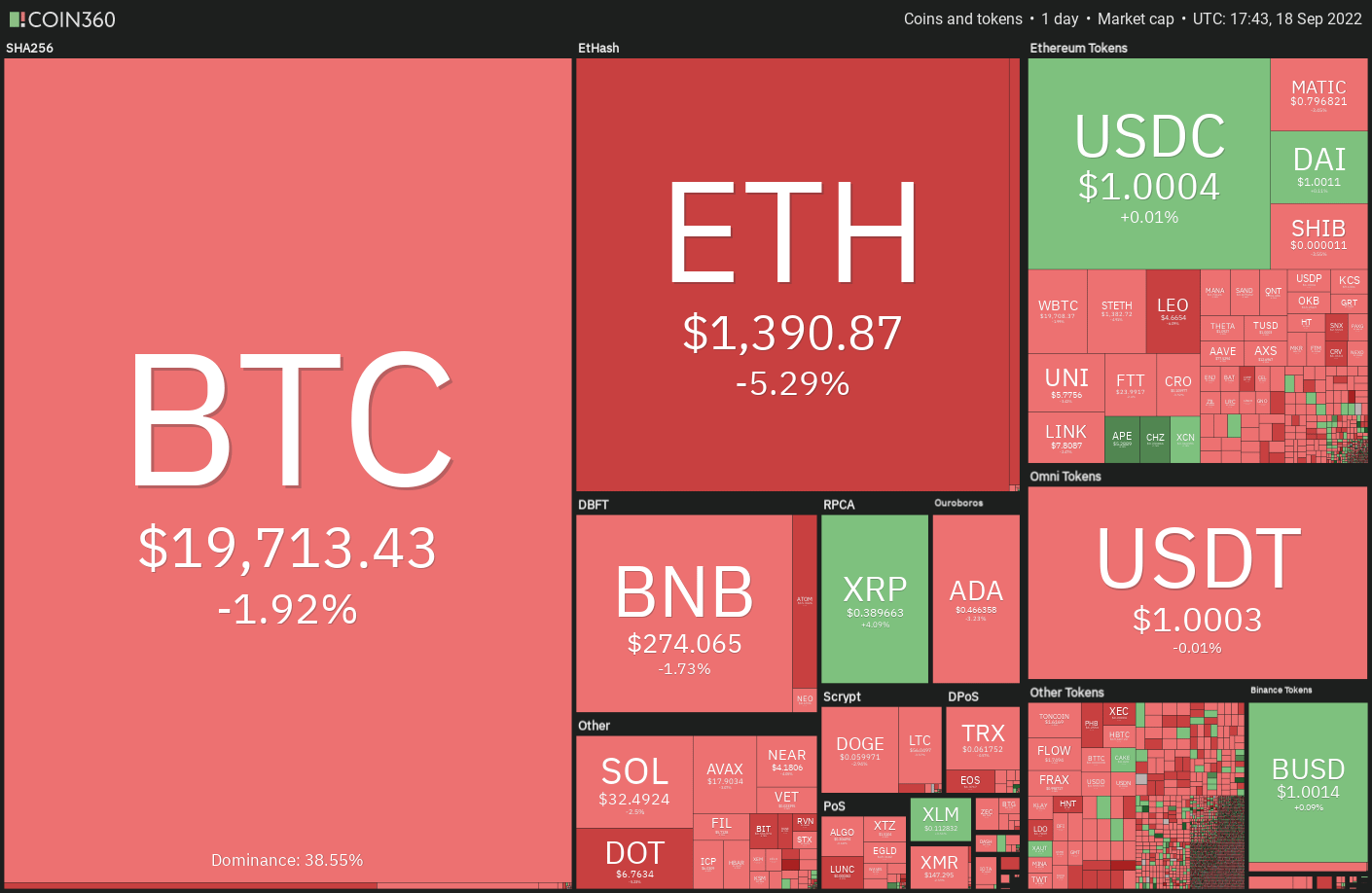 Bitcoin recovered from $19,320 on Sept. 16 and rallied above $20,000 on Sept. 17 but the bulls are struggling to sustain the higher levels. This suggests that bears are active at higher levels.