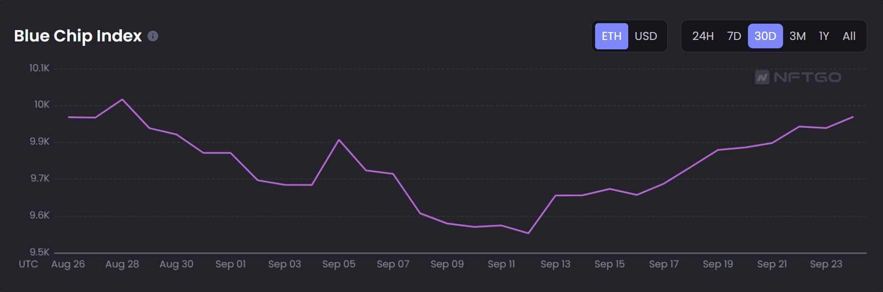 Since Sept. 12, the performance of blue-chip NFT collections witnessed a steady growth, inching back toward the 10,000 Ether (ETH) that was lost in mid-August 2022, according to data by NFTGo.