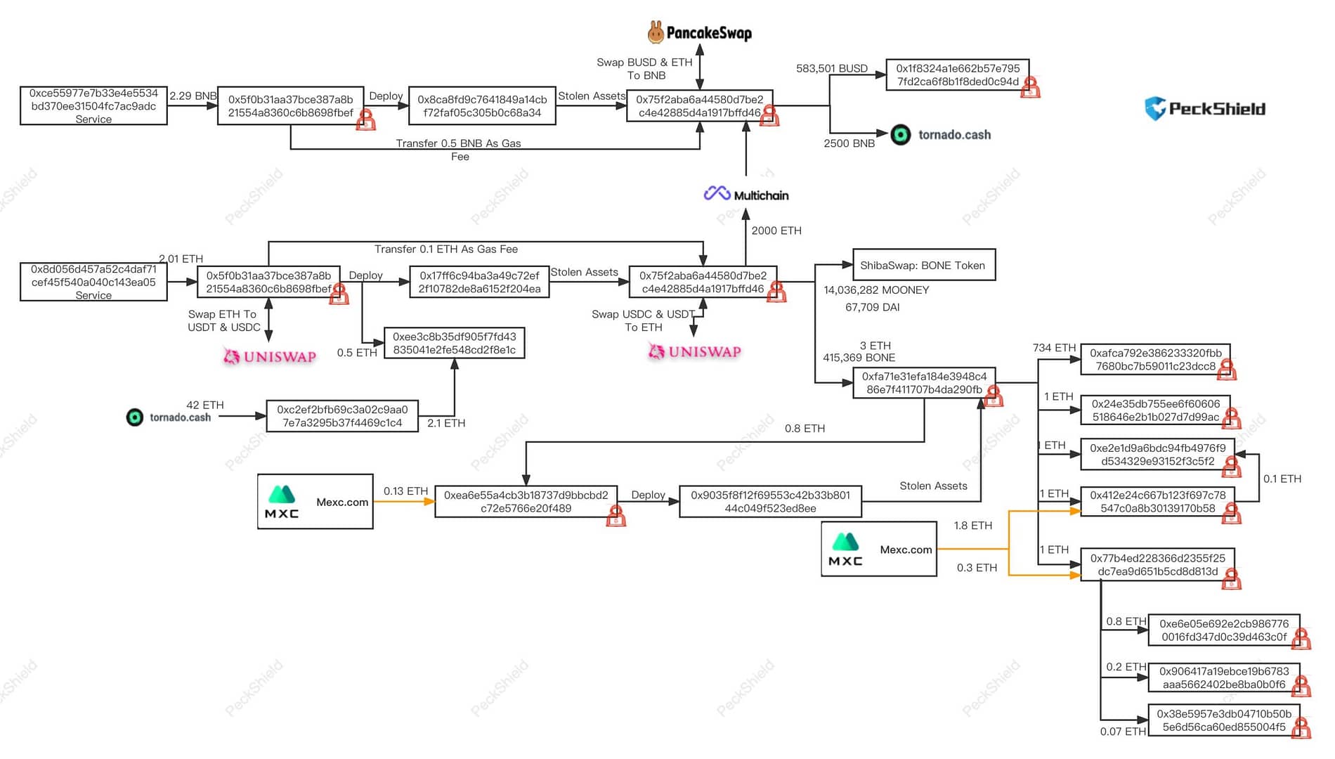 The flowchart below depicts the flow of the stolen assets, as shared by Peckshield.